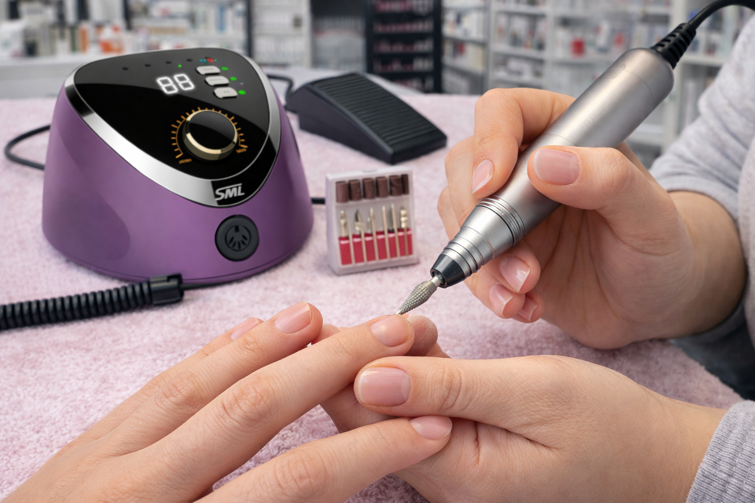 La Fresa SML M12 è un micromotore professionale progettato per manicure e pedicure tecniche, ideale per velocizzare i lavori di preparazione, rimozione prodotto e rifinitura delle strutture. Solida e pratica da utilizzare, permette di lavorare con precisione grazie alla regolazione manuale della velocità e alla possibilità di controllo tramite pedale.